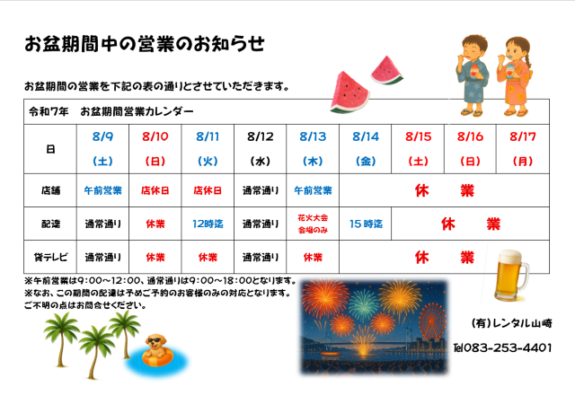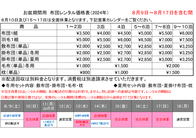 - お盆期間中の布団レンタルの営業についてのご案内です