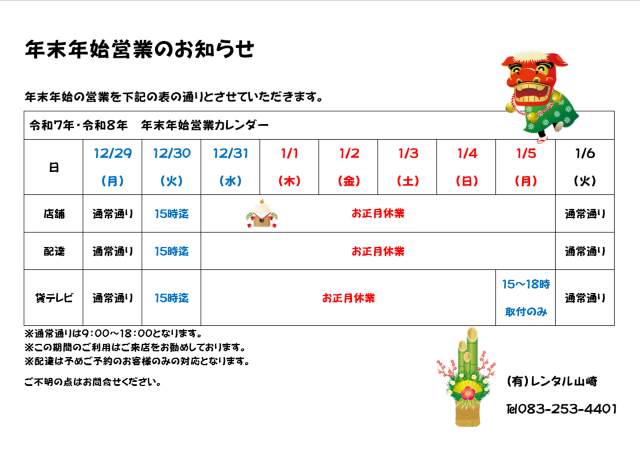 | 営業時間 | ◆営業時間 9:00~18:00 ◆土曜日の営業について 店舗営業のみ12時閉店といたします。 あらかじめの予約配達と病院貸しテレビは通常通り営業いたします。 ※営業時間は予告なく見直し変更いたします。都度お電話にてお尋ねください。 |
