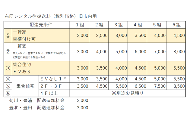 - 布団の配送料料金表です。